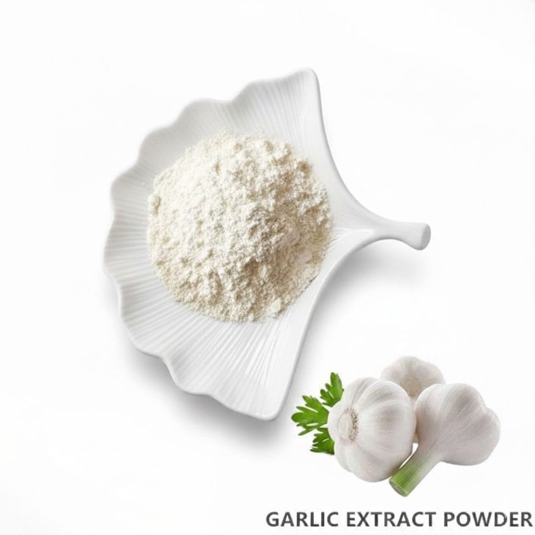 Garlic extract powder is derived from the dehydrated bulbs (cloves) of garlic. These bulbs are rich in alliin, a precursor to allicin, which serves as the primary source of the active compounds. Garlic is packed with essential nutrients, including thiamine, riboflavin, nicotinic acid, allicin, citral, and trace elements like selenium and germanium. It contains approximately 0.2% volatile oil, with allicin as its main constituent. Allicin, known for its antibacterial properties, is formed when alliin in garlic is hydrolyzed by the enzyme alliinase. Garlic also contains unique biologically active substances, such as superoxide dismutase, which contribute to its antibacterial, anti-inflammatory, anti-cancer, cardiovascular disease prevention and treatment, enhanced cellular immune function, and liver-protective effects. Garlic is often referred to as a "natural antibiotic" and was recognized by Time magazine as one of the top ten nutritional foods.
